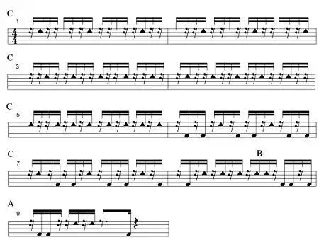 The following nine-measure excerpt is from the quinto performance on “La polémica," composed by Israel Berriel González.[9] The quinto moves between three different modes (A, B, C).[10] The previous quinto example, and the last measure of the following example are both in the basic mode (A), commonly called the quinto lock, or ride in North America.