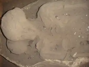 At the laboratory remains of human bones were found inside, which corresponds to a child. Probably the infant relatives deposited a small vase as offering, the dirt containing the urn still had the mold of the small vessel that was extracted and stolen by vandals.