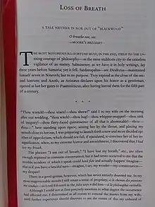"Loss of Breath", also known as "Loss of Breath: A Tale Neither In Nor Out of 'Blackwood' ", is a short story written by American author Edgar Allan Poe under the pseudonym "Littleton Barry".[1] A satirical tale, the story is narrated by Mr. Lackobreath who recounts his attempt to find and reclaim his lost breath, which he had literally misplaced. Throughout his journey, he is repeatedly dismembered and disfigured, falsely assumed to be dead, hanged, locked away, and prematurely interred. The absurd exaggerations may be explained by the fact that the tale was meant to satirize fiction published in the Edinburgh Blackwood Magazine, which was known for its sensational texts.[2]