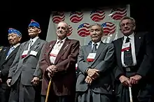 In 1962, Texas Governor John Connally made the veterans of the 442nd "honorary Texans" for their role in the rescue of the Lost Battalion.[3] Three members of the 442nd, Barney Hajiro, James Okubo, and George Sakato, were awarded the Medal of Honor for their participation in the rescue, although due to the discrimination of that era, they were originally awarded lesser medals; a review in the 1990s resulted in them being upgraded to the Medal of Honor, which the men received in 2000, Okubo posthumously.[5] A special law was passed in 2010 awarding members of the unit, and those of the Military Intelligence Service, the Congressional Gold Medal, for which a ceremony was held at the Emancipation Hall of the U.S. Capitol in October 2011, followed by local ceremonies in California, Hawaii, and other states from which unit members had been unable to travel to Washington, D.C.