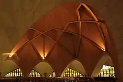 All Baháʼí Houses of Worship, including the Lotus Temple, share certain architectural elements, some of which are specified by Baháʼí scripture. ʻAbdu'l-Bahá, the son of the founder of the religion, stipulated that an essential architectural character of a House of Worship is a nine-sided circular shape.[9] While all current Baháʼí Houses of Worship have a dome, this is not regarded as an essential part of their architecture.[10] Baháʼí scripture also states that no pictures, statues or images be displayed within the House of Worship and no pulpits or altars be incorporated as an architectural feature (readers may stand behind simple portable lecture stands).[8]