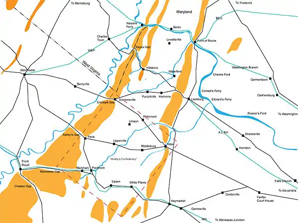 Located just 35 miles (56 km) west-northwest of Washington, D.C., on the south bank of the Potomac River and at the foot of the Blue Ridge, Loudoun served as a connection between northeastern Virginia and the lower Shenandoah Valley as well as between northern Virginia and central Maryland.[2] It was also seen by the Union as a potential staging point for an attack on Washington by way of the Rockville Pike (present-day Maryland Route 355).[3]