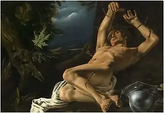 Other than the copies after Caravaggio made after 1606, there are almost no known paintings by Finson before 1610. The signed but not dated Venus and Cupid with an unlikely couple (At Dorotheum on 13 October 2010 in Vienna, lot 352) was likely made in Italy not long after his arrival in Italy and before his exposure to the naturalism of Caravaggio. It shows that at this time Finson was still influenced by the Mannerist school of painting at the court of Rudolph II in Prague, with its preference for exploring erotic motives as well as by the Mannerist style of Antwerp painters such as Jacob de Backer.[5] A Saint John the Baptist preparing himself for his martyrdom in a private collection was attributed to Finson in 2019 and is dated to approximately 1607. It shows Finson's confrontation with the work of Caravaggio. The painting offers an original interpretation of the subject. The foreground is dominated by the nude torso of the saint, shown in a submissive pose a few moments before his beheading. On the left are the heads of Salome and the old maid, who is close to the old maid in Caravaggio's File:Salome with the Head of John the Baptist-Caravaggio in the National Gallery in London.[12] A Caravaggesque painting of the Martyrdom of Saint Sebastian (Parish church of Rougiers, France) was previously dated 1615 but has now been dated 1610. This would place it in the Italian period of the artist.[5][12]