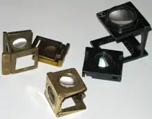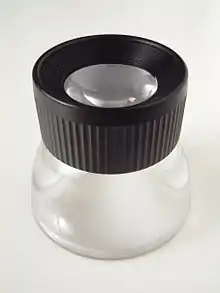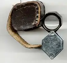 A loupe (/ˈluːp/ LOOP) is a simple, small magnification device used to see small details more closely. Unlike a magnifying glass, a loupe does not have an attached handle, and its focusing lens(es) are contained in an opaque cylinder or cone or fold into an enclosing housing that protects the lenses when not in use. Loupes are also called hand lenses.