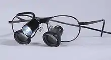 As dental professionals use both hands in performing dental procedures, dental loupes are binocular and usually take the form of a pair of glasses. Some dental loupes are flip-type, which take the form of two small cylinders, one in front of each lens of the glasses. Other types are inset within the lens of the glasses. A typical magnification for use in dentistry is 2.5×, but dental loupes can be anywhere in the range from 2× to 8×.[10]