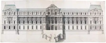 After several meetings, the Petit Conseil drew up two schemes, and, according to the Registre, "one was adorned with an order of columns forming a peristyle or gallery above the first floor [i.e., the ground floor], and the other was simpler and more unified, without an order of columns".[15] The architects of the designs were not identified.[16] On 14 May, at the royal Château de Saint-Germain-en-Laye,[16] two paintings[17] of the proposals were shown to Louis XIV, who chose the design with the colonnade.[16] In July 1667 Colbert finally informed Bernini that his plans had been abandoned.[18] The new façade was begun that summer and was mostly complete in 1674, when the stones of the central pediment were hoisted into place.[19]