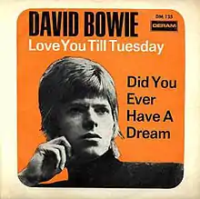 "Love You till Tuesday" is a song written and performed by David Bowie. The first version of the song, recorded in February 1967, was included on Bowie's debut album. A second version, released as a single, was recorded on 3 June 1967 and released on 14 July 1967. The single garnered good notices from the music press but, like his earlier singles, failed to break into the British charts. It was his final new release for Deram Records. Bowie's 1969 showpiece film Love You till Tuesday took its name from the song, which also featured over the opening credits.