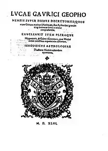 Luca Gaurico (in Latin, Lucas Gauricus) (Giffoni March 12, 1475 – March 6, 1558 in Rome) was an Italian astrologer, astronomer, astrological data collector[1] and mathematician. He was born to a poor family in the Kingdom of Naples, and studied judicial astrology, a subject he defended in his Oratio de Inventoribus et Astrologiae Laudibus (1508). Judicial astrology concerned the fate of man (astrologia judiciaria; mundane astrology) as influenced by the stars. His most famous work is the Tractatus Astrologicus.