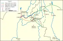 ![]() Map of the overview of Luchuan-Pingmian campaigns that contains the Ming attack routes in the year of 1441,1444 and 1449 battles that under Wang Ji's command. | |||||||