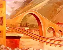 A series of paintings made in Italy in 1944/45 attracted considerable attention. Unlike many war artists, who depicted what they saw in a plain, illustrative style, Mactarian applied a Contemporary Realist approach to his paintings and drawings which at times bordered on Surrealism as they portrayed both the large-scale physical destruction of war and, particular to the Engineers, the striking incongruity of large geometric structures (such as pre-fabricated Bailey bridges, concrete bunkers, or gas pipelines) imposed on Italy's ancient landscapes.