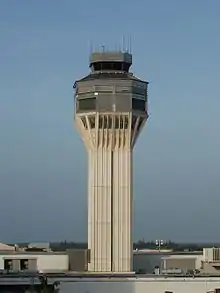 In the period from 1990 to 2000, several infrastructure works were carried out with an investment of approximately $128 million. Some of these include the expansion of the two-level access road to a maximum of 10 lanes on both levels, the new air traffic control tower (designed by Segundo Cardona FAIA of SCF Architects[9]), a parallel taxiway connecting lanes 8 and 10, a parking garage, and the first and second phase of the Terminal B expansion, modification, and rehabilitation project.