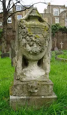 She was buried wearing her black and leopard skin finery and a pair of false eyelashes. She was also interred with one of her beloved stuffed pekinese dogs.[21] Her tombstone is a small grave marker in the shape of an urn draped in cloth with a swag of flowers to the front. The inscription on the tombstone, which misspells her "Louisa" rather than "Luisa", is inscribed with the quote, "Age cannot wither her, nor custom stale her infinite variety", from Shakespeare's Antony and Cleopatra.