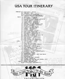 The band played several warm up shows in N.Y.C., Texas, and Oklahoma in late December 1988, with the official U.S. tour beginning in late February 1989, and lasting for four months, ending in June 1989.[2][3] The band played two shows around Halloween in Baltimore and D.C. to promote the "Witchcraft" single.[4]