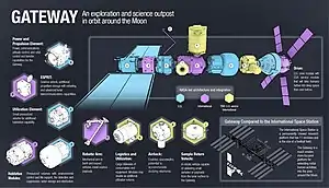 The Lunar Gateway, or simply the Gateway, is a planned small space station in lunar orbit intended to serve as a solar-powered communication hub, science laboratory, short-term habitation module, and holding area for rovers and other robots.[4]