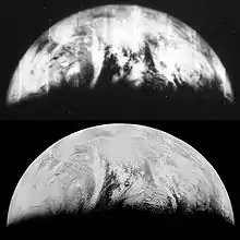 During the Lunar Orbiter missions, the first pictures of Earth as a whole were taken, beginning with Earth-rise over the lunar surface by Lunar Orbiter 1 in August, 1966. The first full picture of the whole Earth was taken by Lunar Orbiter 5 on 8 August 1967.[2] A second photo of the whole Earth was taken by Lunar Orbiter 5 on 10 November 1967.