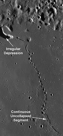 The existence of a lava tube is sometimes revealed by the presence of a "skylight", a place in which the roof of the tube has collapsed, leaving a circular hole that can be observed by lunar orbiters.[3][4]