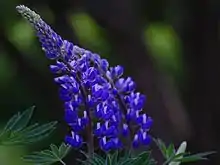 It is a perennial herbaceous plant with stout stems growing to 1.5 metres (4.9 ft) tall. The leaves are palmately compound with (5-) 9-17 leaflets 3–15 centimetres (1.2–5.9 in) long. The flowers are produced on a tall spike, each flower 1–1.5 centimetres (0.39–0.59 in) long, most commonly blue to purple in wild plants. The flowers are mostly visited by bumblebees.[3] The polyphyllus variety in particular make up a great number of the hybrids which are generally grown as garden lupines, they can vary dramatically in colours. The majority of lupines do not thrive in rich heavy soils, and often only live for a matter of years if grown in such places, because crown contact with manure or rich organic matter encourages rotting.