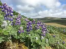 In New Zealand, where it is known as the Russell lupin, Lupinus polyphyllus is classed as an invasive species[13][14] and covers large areas next to roadsides, pastures and riverbeds, especially in the Canterbury region. It is documented as being first naturalised in 1958 and it has been suggested that tour bus drivers deliberately spread seeds of the plant to promote colourful roadside vegetation in areas which some tourists may consider to be rather drab. The plant threatens indigenous species especially when it invades the braided river beds in the South Island.[14]