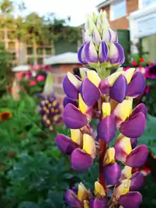 The herbaceous lupine, Lupinus polyphyllus, arrived in Britain from North America in the 1820s, brought over by David Douglas. Almost a century later, George Russell, a horticulturist from York, UK, started to breed the (later famous) Russell hybrids (Lupinus X russellii hort).[6][7] Lupinus polphyllus originally were of basic colours and had large gaps in the flowering spike. Without the use of modern-day plant breeding techniques, Russell took to ruthlessly pulling out any plants which he deemed to be unacceptable in growth or display. He spent two decades single-handedly trying to breed the perfect lupine, crossing L. polyphyllus with L. arboreus, L. sulphureus and one or more annual species (maybe L. nootkatensis).