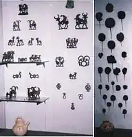 The bronzes tend to be flat and use openwork, like the related metalwork of Scythian art. They represent the art of a nomadic or transhumant people, for whom all possessions needed to be light and portable, and necessary objects such as weapons, finials (perhaps for tent-poles), horse-harness fittings, pins, cups and small fittings are highly decorated over their small surface area.[6] Representations of animals are common, especially goats or sheep with large horns, and the forms and styles are distinctive and inventive. The "Master of Animals" motif, showing a human positioned between and grasping two confronted animals is common[7] but typically highly stylized.[8] Some female "mistress of animals" are seen.[9]