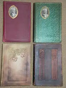 Another unusual leather-bound edition has a grape vine with grapes on a T-trellis on the covers. These have very heavy (wood?) boards.