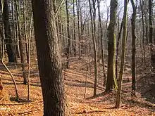 The campus sits on an extensive sand plain, the delta of the prehistoric "Iromohawk" river as it entered Lake Albany at the end of the last ice age.[2][3] When the early settlers cleared the forests and ploughed the soil they quickly discovered that the thin layer of topsoil blew away and the underlying sand piled up in large drifts.
