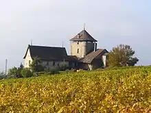 The castle was built in the 15th and 16th centuries as the home of the Bishop of Lausanne's representative, the Mayor de Lutry family. The large gate house into the castle was built around the end of the 16th century, while the large coat of arms is from 1640.[17]