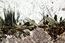 Thin section of luxullianite from Cornwall, showing clusters of radially-arranged, acicular, greenish tourmaline crystals