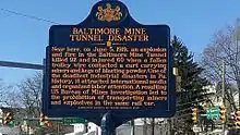 Despite the better working conditions, industrial accidents were still commonplace. On December 6, 1915, an underground mine fire started in the Red Ash Coal Mine near the communities of Laurel Run and Georgetown. Hundreds of residents living near the mine fire were later relocated. The fire continued to burn well into the 21st century.[29] On June 5, 1919, another major mining accident occurred nearby. An explosion killed 92 miners at the Baltimore Colliery in Wilkes-Barre.[30]