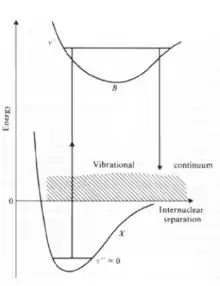 - 10-15% of the decays occur into the vibrational continuum. This means that the hydrogen molecule has dissociated.