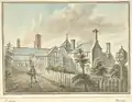 A series of letters between Edward Herbert and his agent Roger Jones[8] provides a fairly detailed outline of the building work that was taking place. In the first letter Lord Herbert of Cherbury is undecided whether to re-build at Black Hall, below the Castle at Montgomery or at Lymore. He, however, decides to have 300,000 bricks fired at the estate brickyard (this would have been at the Stalloe brickyard to the North East of Montgomery). He then acquires more land at Lymore and proceeds with demolishing "Powell's" house to use for timber for Lymore. There is then a detailed account of the construction work and particularly alterations to the staircase. It has been speculated that the staircase, which, in 1931, was removed to Aldborough Hall in Yorkshire, came from the New Build, in Montgomery Castle, but this is unsubstantiated. Although Lymore is thought primarily as being a timber framed house, a huge quantity of bricks were used in the extensive kitchen and service wing that lay to the south. This was pulled down after 1795.[9] Early bricks were also used in the walled garden and the Steward's house which was reconstructed in 1931. The earliest drawing of Lymore is dated July 1684, when it was sketched by Thomas Dineley, who was accompanying the Duke of Beaufort on his progress through Wales.[10] The north frontage of the house was shown with six gables. A survey of the valuation of Lands belonging to the Earls of Powis in 1785[11] shows the house with eight gables. The house was drawn by Moses Griffiths for Thomas Pennant in 1775, during his tour of Montgomeryshire and Shropshire.[12] Thomas Pennant intended to re-publish this tour and in 1794/5 he commissioned three further watercolours of Lymore from John Ingleby, which are now in a collection in the National Library of Wales. These watercolours add greatly to our knowledge of Lymore and particularly for details of the brick service range to the south of the timber framed reception areas of Lymore Hall. An extensive reconstruction of Lymore must have taken place in the early years of the 19th century, when the number of gables on the north frontage were reduced to three.