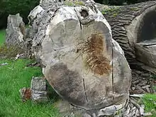 Sawn trunk of Oak Tree that had been blown down. The tree rings indicate it was planted in the late 17th century.