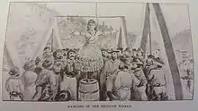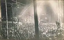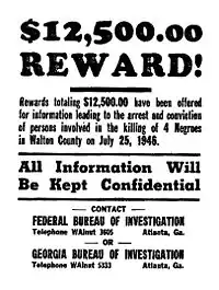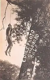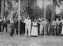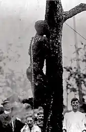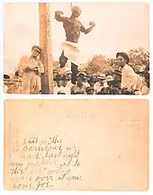 In the post–Reconstruction era South, lynching photographs were printed for various purposes, including postcards, newspapers and event mementos.[69] Typically these images depicted an African-American lynching victim and all or part of the crowd in attendance. Spectators often included women and children. The perpetrators of lynchings were not identified.[70] At one particular lynching, it is said that nearly 15,000 people were in attendance.[69] Often lynchings were advertised in newspapers prior to the event in order to give photographers time to arrive early and prepare their camera equipment.[71] After the lynching, photographers would sell their pictures as-is or as postcards, sometimes costing as much as fifty cents a piece, or $9, as of 2016.[70]