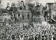 The San Francisco Vigilance Movement has traditionally been portrayed as a positive response to government corruption and rampant crime, but revisionist historians have argued that it created more lawlessness than it eliminated.[26] Four men were executed by the 1851 Committee of Vigilance before it disbanded. When the second Committee of Vigilance was instituted in 1856, in response to the murder of publisher James King of William, it hanged a total of four men, all accused of murder.[27]