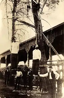 Prior to the Civil War most of the victims of lynching in the South were white men.[3] During the Reconstruction era lynchings were used to enforce white supremacy and intimidate blacks by racial terrorism.[4] The rate of lynchings in the South has been strongly associated with economic strains,[5] although the causal nature of this link is unclear.[6] Low cotton prices, inflation, and economic stress are associated with higher frequencies of lynching.