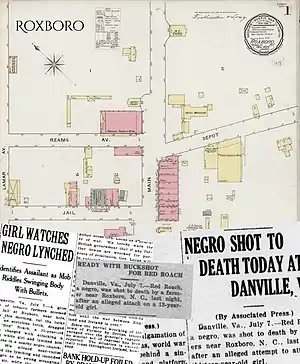 In an orchard in Person County, North Carolina, July 7, 1920, the screams of Edward Chambers' daughter alerted people that she felt threatened by Red Roach. He was able to jump on a Norfolk and Western train at Helena, NC but was arrested by police at the next train stop.[1] He was escorted back to Roxboro, North Carolina and put in jail. A White mob soon formed and stormed the jail dragging Roach to a tree in the courtyard of a church. He was shot to death.[5] A rope was strung over a branch but it was too short so a chain was used to hang Red Roach to death. In the crowd watching was the 13-year-old daughter of tobacco farmer Edward Chambers.[1]