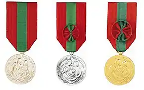 The original medal was an eight pointed radiant star, with a central medallion depicting a mother holding a small child, surrounded by the inscription Famille Française, ("French Family").[1] Since 1983 a circular medal has been awarded, bearing the words Famille Française above a modernistic image of a couple and their children. The words "République Française" ("French Republic") are inscribed on the reverse side. The ribbon of both versions is the same, and has three equal parts, the outer two being red and the inner green. Recipients of silver and gold medals are also granted a rosette in the same colours.