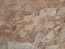 In geology, a mélange is a large-scale breccia, a mappable body of rock characterized by a lack of continuous bedding and the inclusion of fragments of rock of all sizes, contained in a fine-grained deformed matrix. The mélange typically consists of a jumble of large blocks of varied lithologies. Both tectonic and sedimentary processes can form mélange.