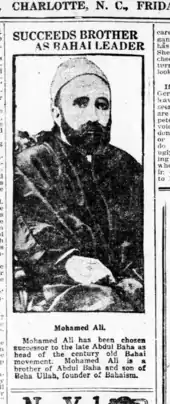 At the time of ʻAbdu'l-Bahá's death, Shoghi Effendi was appointed the Guardian of the Faith by ʻAbdu'l-Bahá in his Will and Testament, while Muhammad ʻAlí was reprimanded in the same document as "The Center of Sedition, the Prime Mover of mischief."[7] Because Baháʼu'lláh's Kitáb-i-ʻAhd named Muhammad ʻAlí as "after" ʻAbdu'l-Bahá's, he took the opportunity of ʻAbdu'l-Bahá's death to try to revive his claim to leadership, but his attempt to occupy the Shrine of Baháʼu'lláh by force left him on the losing end of a legal battle that removed any rights he had to the property.