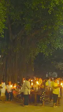 Māgha Pūjā (also written as Makha Bucha Day) is the second most important Buddhist festival,[1] celebrated on the full moon day of the third lunar month[5] in Cambodia, Laos, Thailand, Sri Lanka and on the full moon day of Tabaung in Myanmar. It celebrates a gathering that was held between the Buddha and 1,250 of his first disciples, which, according to tradition, preceded the custom of periodic recitation of discipline by monks. On the day, Buddhists celebrate the creation of an ideal and exemplary community, which is why it is sometimes called Saṅgha Day, the Saṅgha referring to the Buddhist community, and for some Buddhist schools this is specifically the monastic community.[6][1] In Thailand, the Pāli term Māgha-pūraṇamī is also used for the celebration, meaning 'to honor on the full moon of the third lunar month'.[7] Finally, some authors referred to the day as the Buddhist All Saints Day.[8][9]
