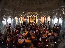 The five Dilwara Temples on Mount Abu are among the most famous Jain temples. The Vimal Vasahi is much the earliest, constructed by 1031, with the Luna Vasahi by 1230, and the others at intervals between 1459 and 1582. All are in a very white marble that adds greatly to their effect, and remain in use. The oldest and largest two have large amounts of intricate carving even by the standards of the style, reaching a peak in the Luna Vasahi temple. The main buildings of the first three named are surrounded by "cloister" screens of devakulikā shrines, and are fairly plain on the outer walls of these; in the case of the Vimal Vasahi this screen was a later addition, around the time of the second temple. These three have an axis from the sanctuary through a closed, then an open mandapa to an open rangamandapa, or larger hall for dance or drama.[19] Surrounding the main temple with a curtain of shrines was to become a distinctive feature of the Jain temples of West India, still employed in some modern temples.[20]