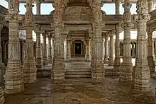 The Adinatha Ranakpur Jain temple in Rajasthan is a major construction for a merchant, built between 1439 and 1458 or 1496. It is a thorough-going, but not strict, revival of Māru-Gurjara style, on the same broad model as Bhadreshwar, with a high outside wall of the back of shrines, but also a number of Islamic-style corbelled domes. There are four three-storey porches, already up two flights of steps. The interior of the temple is "unsurpassed for its spatial complexity", with the sanctuary at the centre of the compound surrounded by many mandapas of two or three storeys, with all levels very open between the supporting columns allowing views in several directions inside the compound. Even the shikhara has balconies at three levels. The carving on the interior is in most areas as lavish as ever.[30]