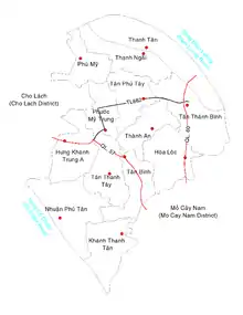 Mỏ Cày Bắc borders Mỏ Cày Nam and Giồng Trôm districts to the east, Chợ Lách District to the west, Vĩnh Long Province to the south and Châu Thành District and Bến Tre town to the north.