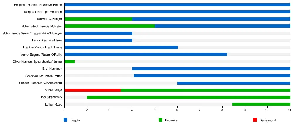 | Benjamin Franklin "Hawkeye" Pierce | Alan Alda | Captain | Chief surgeon | 256 |