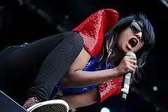 Jimmy Iovine, the chairman of M.I.A.'s American distribution label Interscope, compares M.I.A. to Reed and punk rock songwriter Patti Smith, and recalled, "She's gonna do what she's gonna do, I can't tell her shit."[168] "The really left-of-center artists, you really wonder about them. Can the world catch up? Can the culture meet them in the middle? That's what the adventure is. It doesn't always happen, but it should and it could."[169] Richard Russell, head of XL Recordings, states, "You've got to bend culture around to suit you, and I think M.I.A has done that" adding that M.I.A.'s composition and production skills were a major attraction for him.[170][171] As a vocalist, M.I.A. is recognisable by her distinctive whooping, chanting voice, which has been described as having an "indelible, nursery-rhyme swing."[52] She has adopted different singing styles on her songs, from aggressive raps, to semi-spoken and melodic vocals. She has said of the sometimes "unaffected" vocals and delivery of her lyrics, "It is what it is. Most people would just put it down to me being lazy. But at the same time, I don't want [that perfection]," saying some of the "raw and difficult" vocal styles she used reflected what was happening to her during recording.[20][61]
