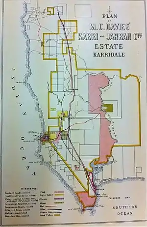By 1894, all six of Davies' sons were involved in his business, and the name of the business was changed from M. C. Davies to M. C. Davies Company Ltd. In that year he constructed what became Bussell Highway and he was also involved in the construction of the Cape Leeuwin Lighthouse in 1895.[3][4] His timber business continued to prosper and expand, but the timber markets expanded even more rapidly, and by 1897 the company no longer had the resources to keep pace with market growth. In that year, Davies went to London to float the business as a public company, under the name M. C. Davies Karri and Jarrah Company Ltd.