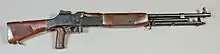 A variant known as the FN Mle 1930 was developed in 7.65×53mm Belgian Mauser by FN Herstal and adopted by the Belgian army. The Mle 1930 is basically a licensed copy of the Colt Automatic Machine Rifle, Model 1925 (R 75).[31] The Mle 1930 has a different gas valve and a mechanical rate-reducing fire control mechanism designed by Dieudonné Saive, located in the trigger guard-pistol grip housing.[31] Some of these FN rate reducer mechanisms and pistol grip housings were later purchased by Springfield Armory for evaluation and possible adoption on a replacement for the M1918.[18] The weapon also had a hinged shoulder plate and was adapted for use on a tripod mount. In 1932 Belgium adopted a new version of the FN Mle 1930 allocated the service designation FN Mle D (D—demontable or "removable"), which had a quick-change barrel, shoulder rest and a simplified take-down method for easier cleaning and maintenance.[32] The Mle D was produced even after World War II in versions adapted for .30-06 Springfield (for Belgian service) and 7.92×57mm Mauser ammunition (for Egyptian service).[25] The final variant in Belgian service was the Model DA1 chambered for the 7.62×51mm NATO cartridge and feeding from the 20-round magazines for the FN FAL battle rifle.[32]