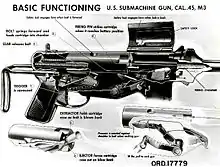 The M3 operating sequence is as follows: the bolt is cocked to the rear using the cocking handle located on the right side of the ejector housing. When the trigger is pulled, the bolt is driven forward by the recoil springs, stripping a round from the feed lips of the magazine and guiding the round into the chamber. The bolt then continues forward and the firing pin strikes the cartridge primer, igniting the round, resulting in a high-pressure impulse, forcing the bolt back against the resistance of the recoil springs and the inertial mass of the bolt. By the time the bolt and empty casing have moved far enough to the rear to open the chamber, the bullet has left the barrel and pressure in the barrel has dropped to a safe level. The M3's comparatively low cyclic rate was a function of the relatively low pressure generated by the .45 ACP round, a heavy bolt, and recoil springs with a lighter-than-normal compression rate.