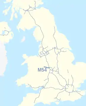 The M54 is a 23-mile (37 km) east-west dual carriageway in the English counties of Shropshire and Staffordshire. It is also referred to as the Telford dual carriageway, after the road's primary westbound destination, the new town of Telford.[1] The dual carriageway cost £65 million to construct, and is two-lane dual carriageway for the majority of its length, with sections of three-lane.[2]