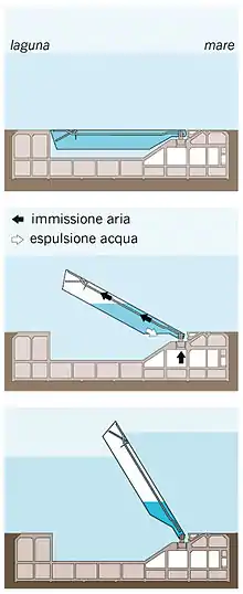 Under normal tidal conditions, the gates are full of water and rest in their housing structures. When a high tide is forecast, compressed air is introduced into the gates to empty them of water, causing them to rotate around the axis of the hinges and rise up until they emerge above the water to stop the tide from entering the lagoon. When the tide drops, the gates are filled with water again and return to their housing.